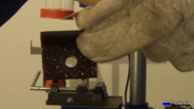 9. Ya nos queda poco para poder disfrutar de nuestra escopleadora casera. Sujetamos la base de la escopleadora a nuestro taladro de columna o soporte para el taladro con unas arandelas, tuercas y tornillos tipo mariposa de 8.