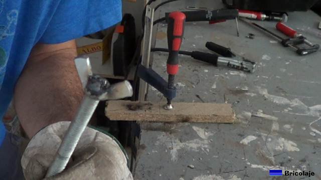 5. Con ayuda de un juego de terrajas y machos, le hacemos una rosca al agujero abierto al ángulo del punto anterior. Para saber como hacer rosca, pincha aquí. De todas formas y en caso de no disponer de juego de terrajas y machos, también podremos soldar una tuerca al ángulo y así disponer de una forma de enroscar un tornillo. En caso de decantarnos por soldar la tuerca al ángulo, deberemos realizar un agujero de 8.5 o 9 mm, en vez de 8 como realizamos en el punto anterior.